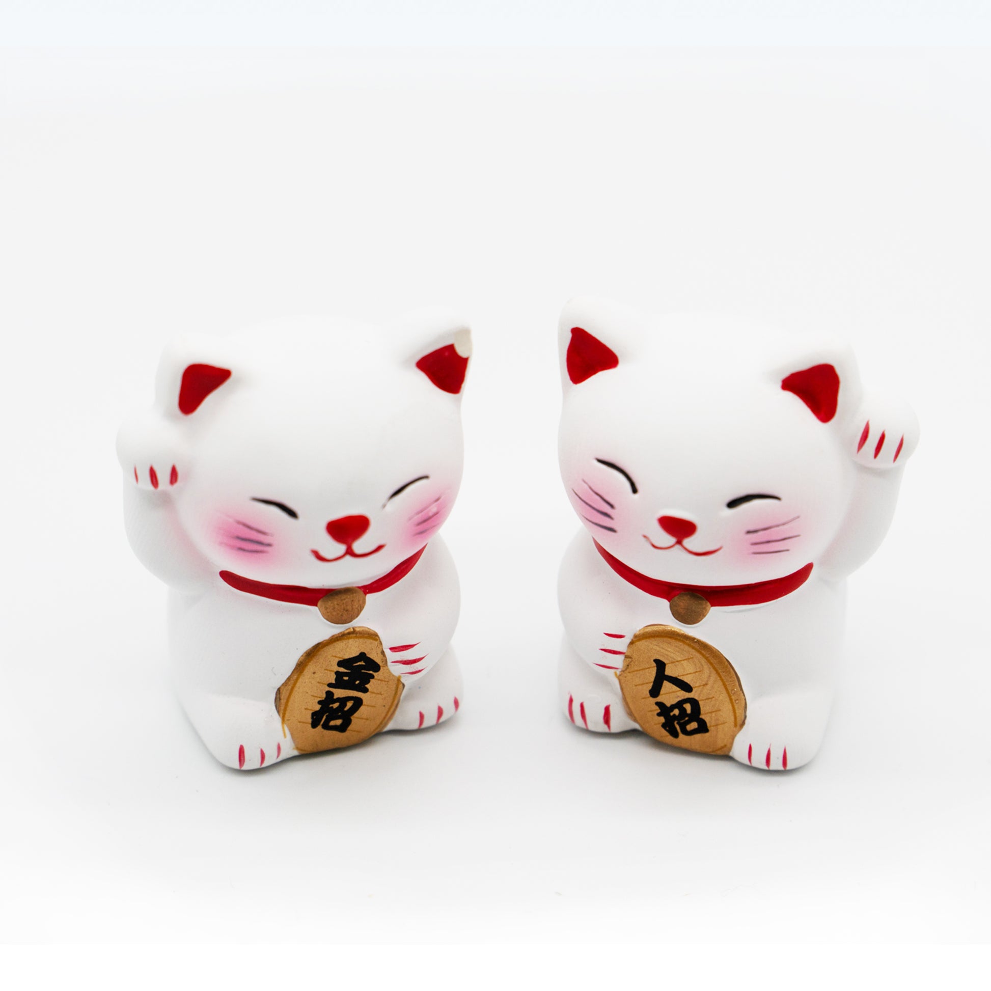 右手を挙げた猫は「金運(金招)」、左手を挙げた猫は「良縁・客招き(人招)」を司ります。それぞれが持つ小判には、その役割を象徴する文字が誇らしげに記されており、あなたの元へ最良の運気を運び込んでくれます。