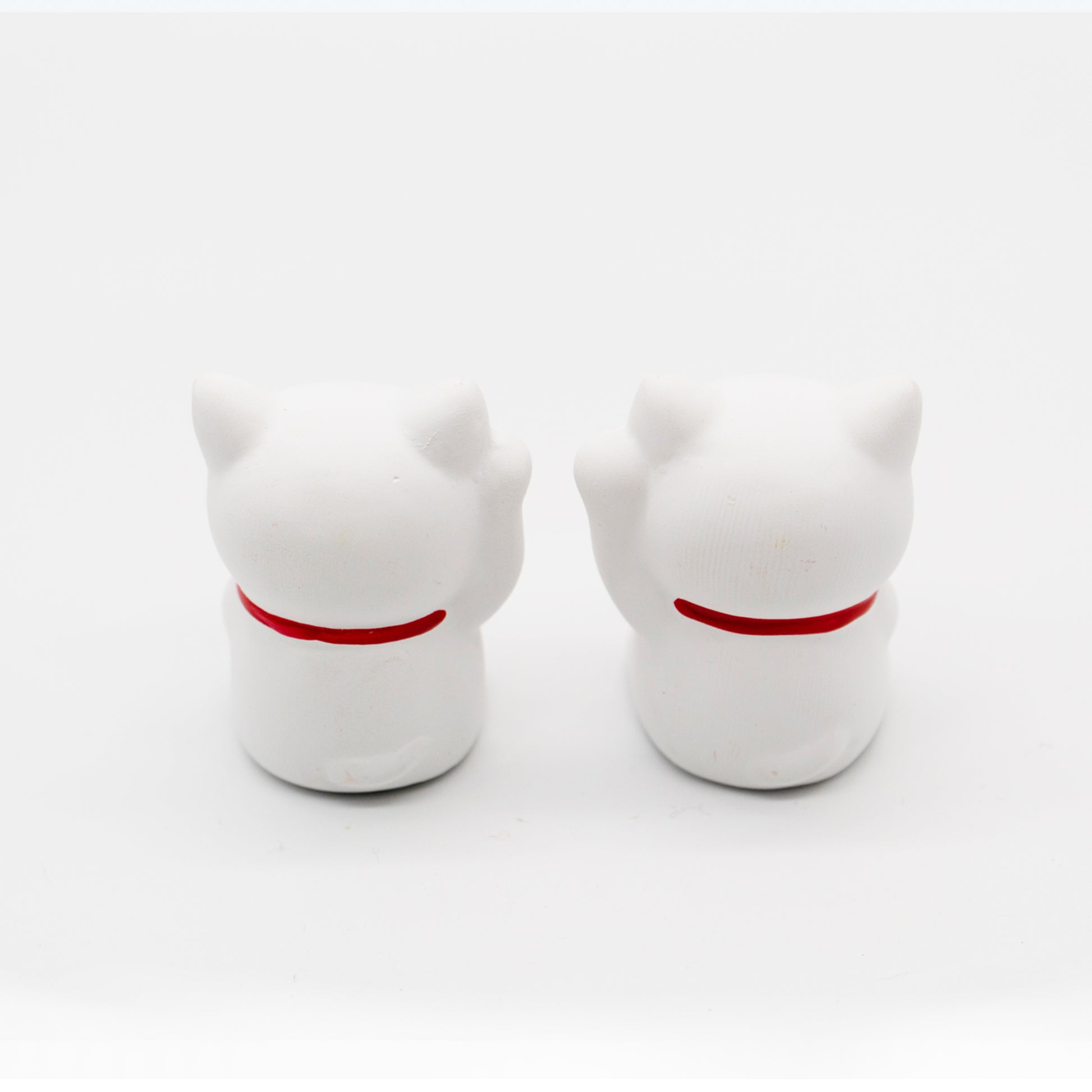 白い陶器の質感に映える、鮮やかな赤い首輪と黄金の鈴。 二匹が並ぶ姿は、見るたびに心を温かくし、前向きな気持ちにさせてくれるはずです。ご自宅の多幸を願うお守りとして、あるいは大切な方の門出を祝う贈り物にいかがでしょうか。